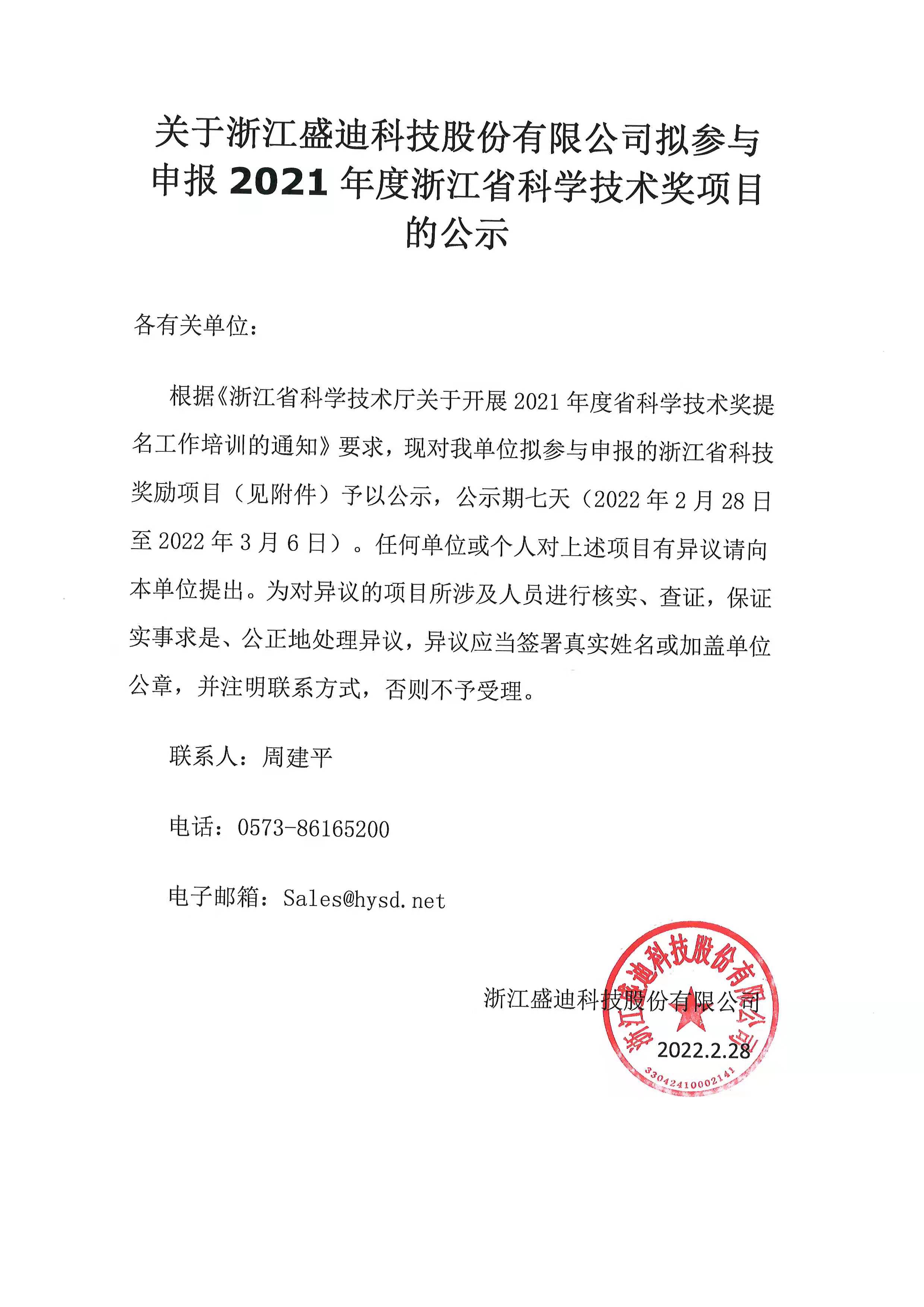 Home / News / Company News / Announcement on the intention of Zhejiang Shengdi Technology Co., Ltd. to participate in the application for the 2021 Zhejiang Science and Technology Awards